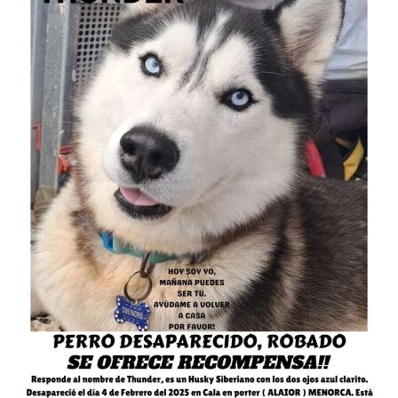 La madrugada del 3 al 4 de febrero. Responde al nombre de Thunder. Color gris/blanco y cola un poco rojiza. ¡Se ofrece recompensa! Llamar al 624 021 200 - 637 349 608, Policia local de Alaior o Veterinario de Alaior.