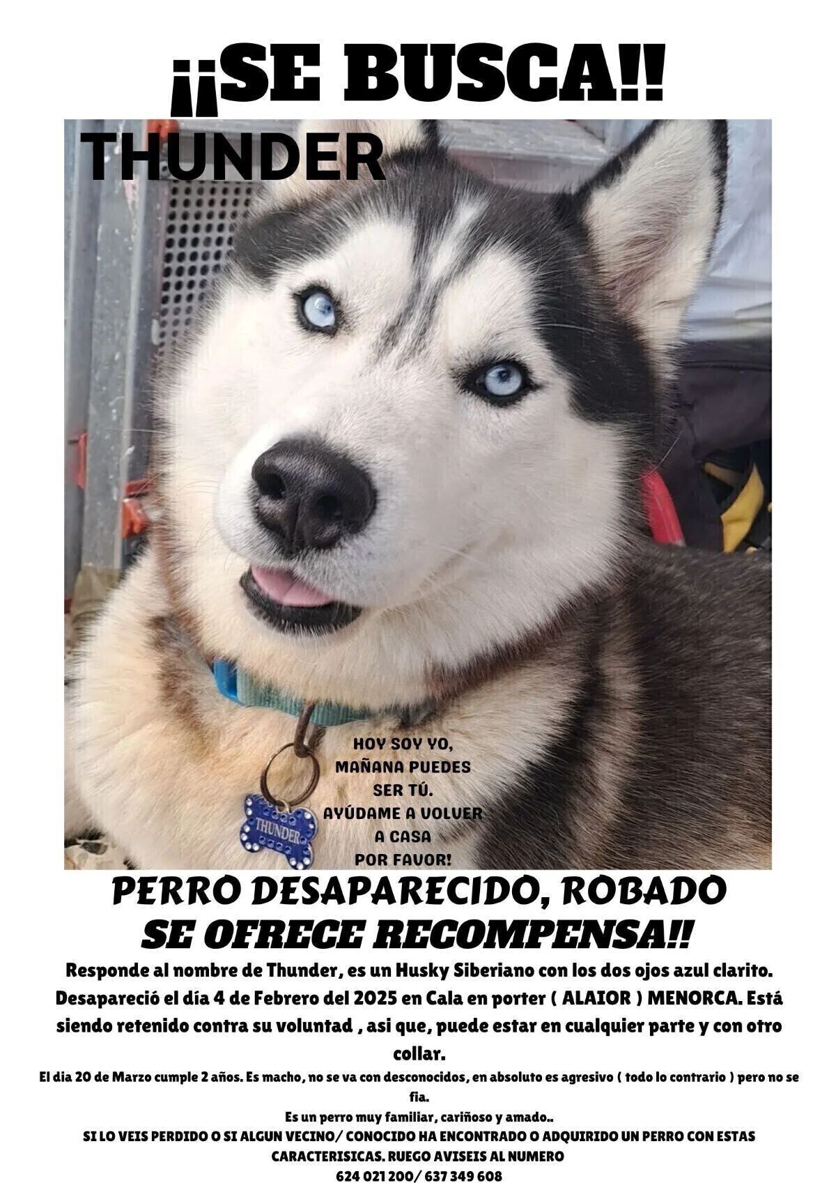 La madrugada del 3 al 4 de febrero. Responde al nombre de Thunder. Color gris/blanco y cola un poco rojiza. ¡Se ofrece recompensa! Llamar al 624 021 200 - 637 349 608, Policia local de Alaior o Veterinario de Alaior.