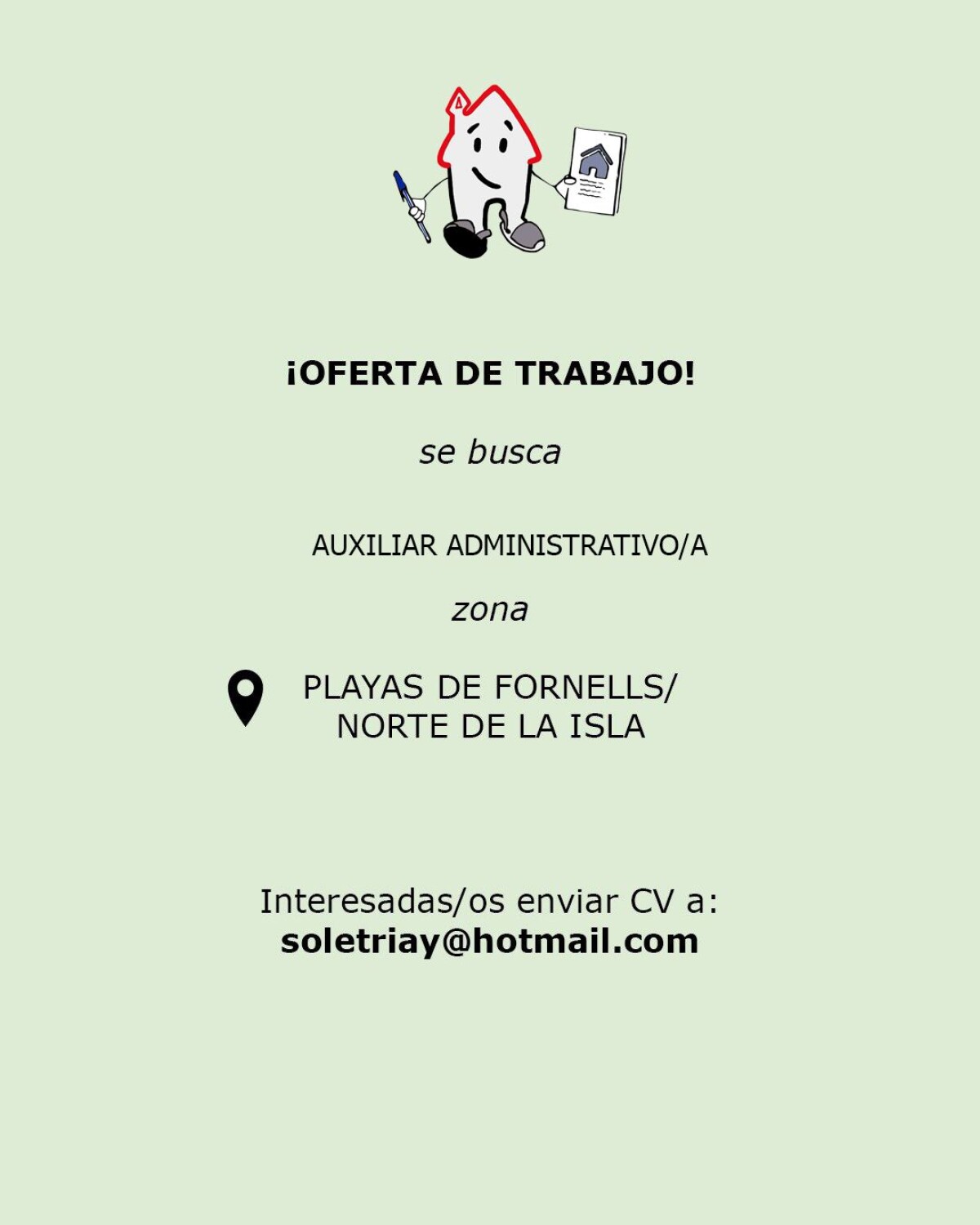 Estamos buscando administrativo/a para Inmobiliaria en Playas de Fornells, para incorporación inmediata. Imprescindible nivel alto de inglés: hablado y escrito. Trabajo para todo el año. Interesadas/os enviar CV a: soletriay@hotmail.com