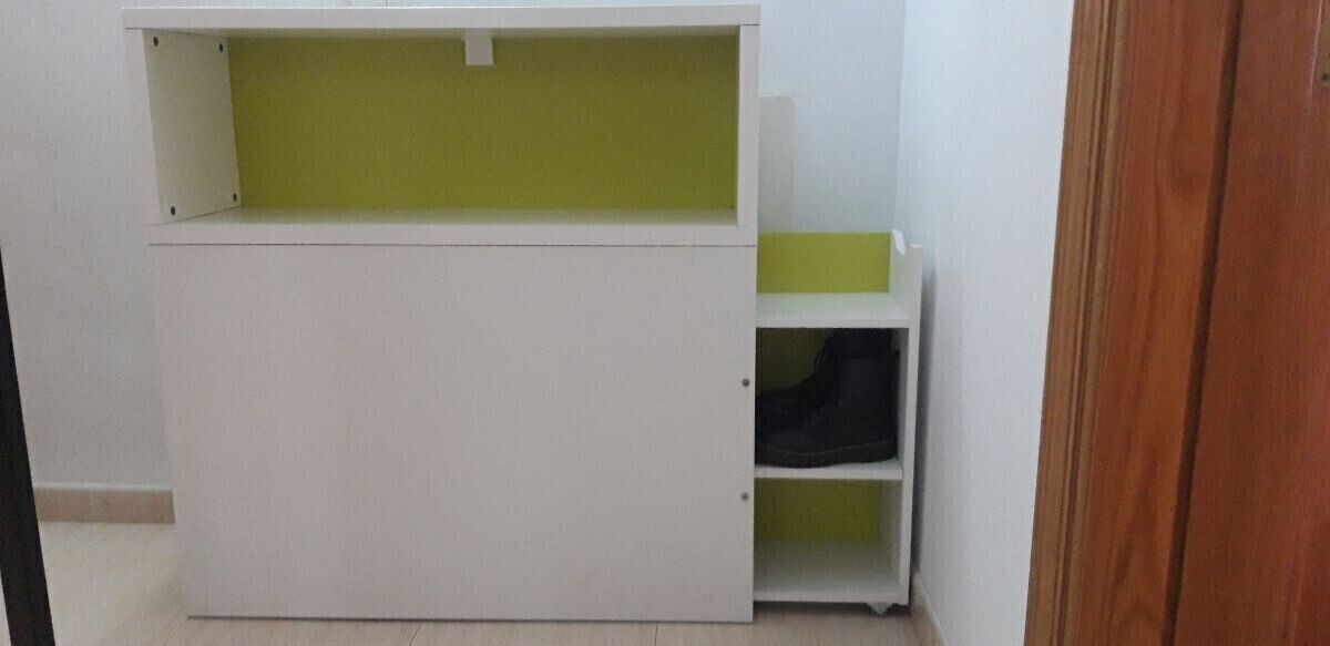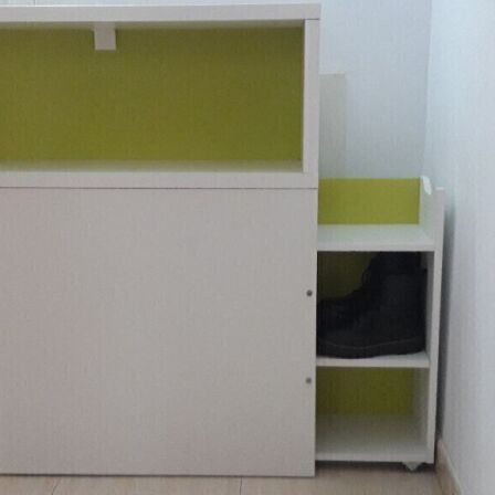 Con zapatero extraible incluido, para cama de 90cm. Ideal para habitación infantil, ya que dispone de su propia balda para usar como mesita de noche. Muy útil para espacios reducidos. Medidas: 97x30x105cm.