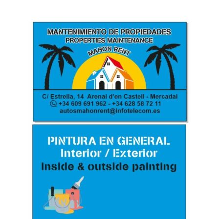 Se realizan trabajos de mantenimiento de propiedades, pintura en general, pequeñas obras, fontanería, electricidad, jardinería y limpieza. Pida presupuesto sin compromiso. No dude en contactar con nosotros llamado o a través de whatsApp.